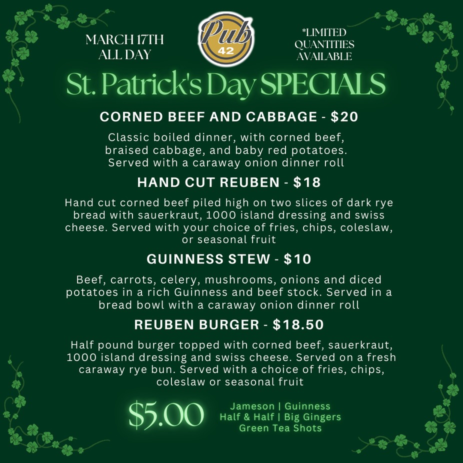 Join us for St. Patrick's Day and enjoy our SPECIALS!